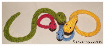 Для изготовления змейки понадобится: немного ниточек (я вязала из всяких остатков — акрил, п/ш), крючок подходящего размера, проволока, лейкопластырь, немного синтепона (можно обойтись без него), бусинки для глазок (у меня крупный бисер), ниточки для вышивки ротика (ирис, мулине), час-полтора свободного времени и, конечно же, желание )).